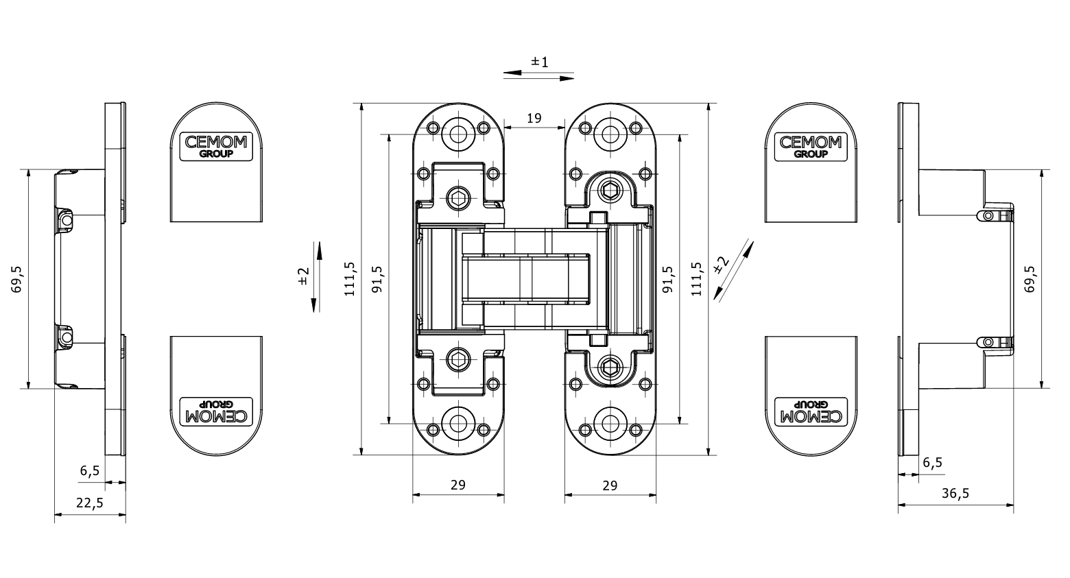 - 3D adjustment: side ±2 mm, height ±2 mm, compression ±1 mm