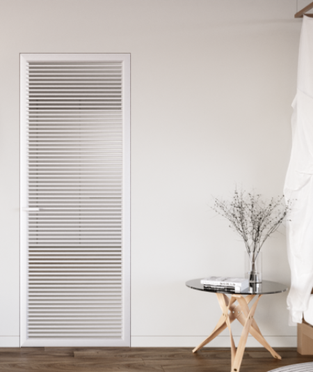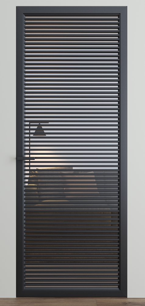 Hinged hidden doors of the Dooris factory are made of aluminum profile and glass.