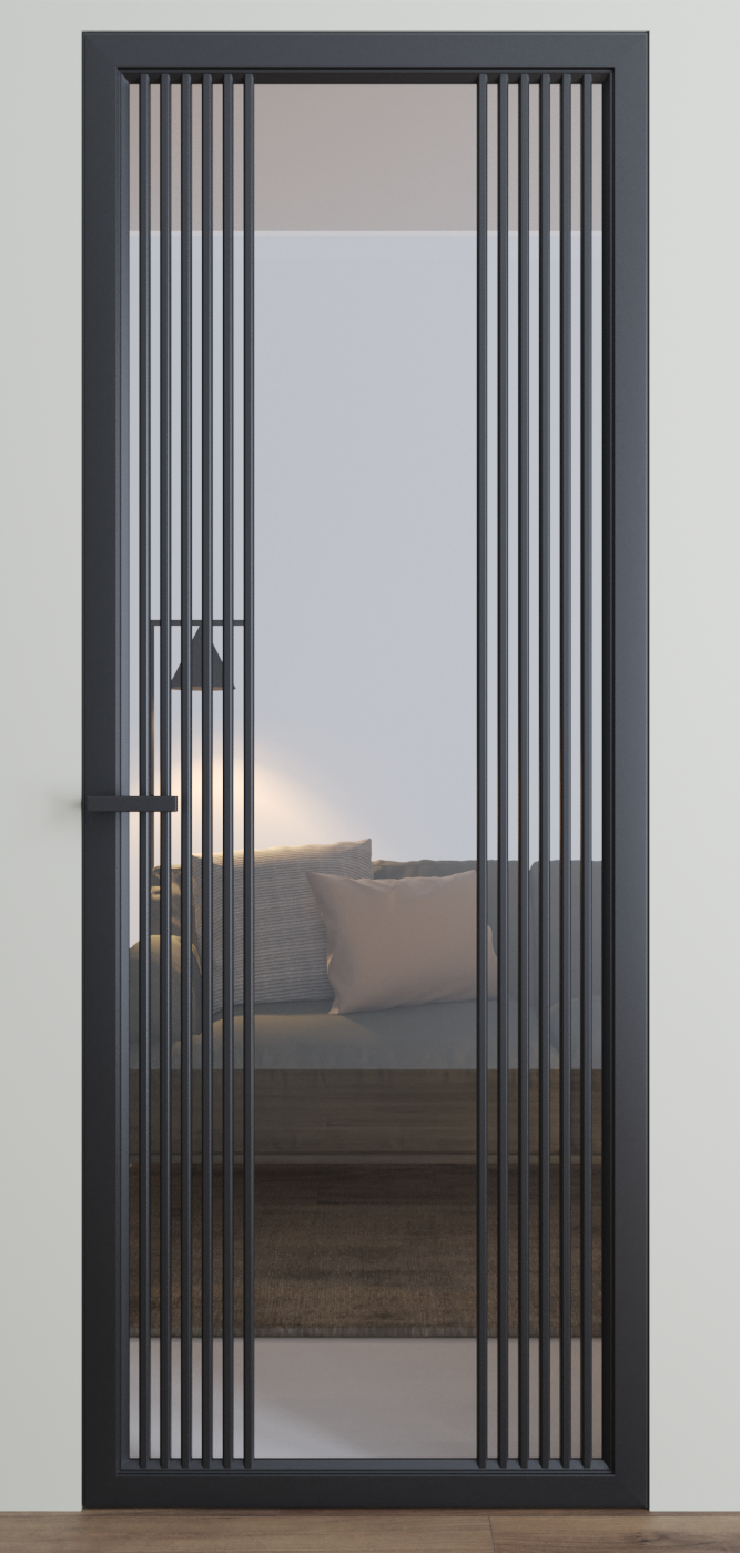 Hinged hidden doors of the Dooris factory are made of aluminum profile and glass.