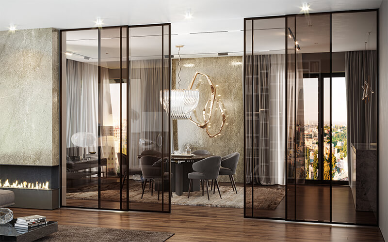 Sliding glass systems can be tailored to suit any interior style — from contemporary minimalism to refined neoclassics. Aluminum frames are available in a range of finishes, including timeless black and warm bronze tones.