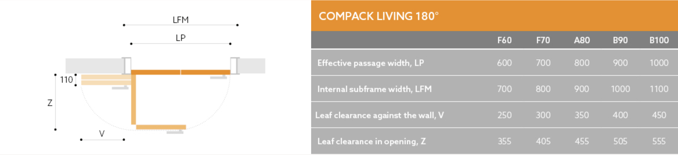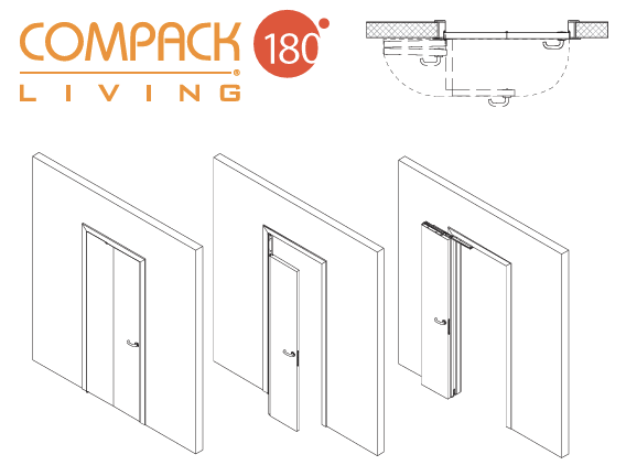 The COMPACK LIVING® 180° system, featuring a new hinge for folding doors, offers ergonomic, stable, and silent operation. This innovative system provides a full 180° opening option. The patented hinge, mounted at the top of the door, enables the leaf, equipped with a handle, to glide parallel to the wall.