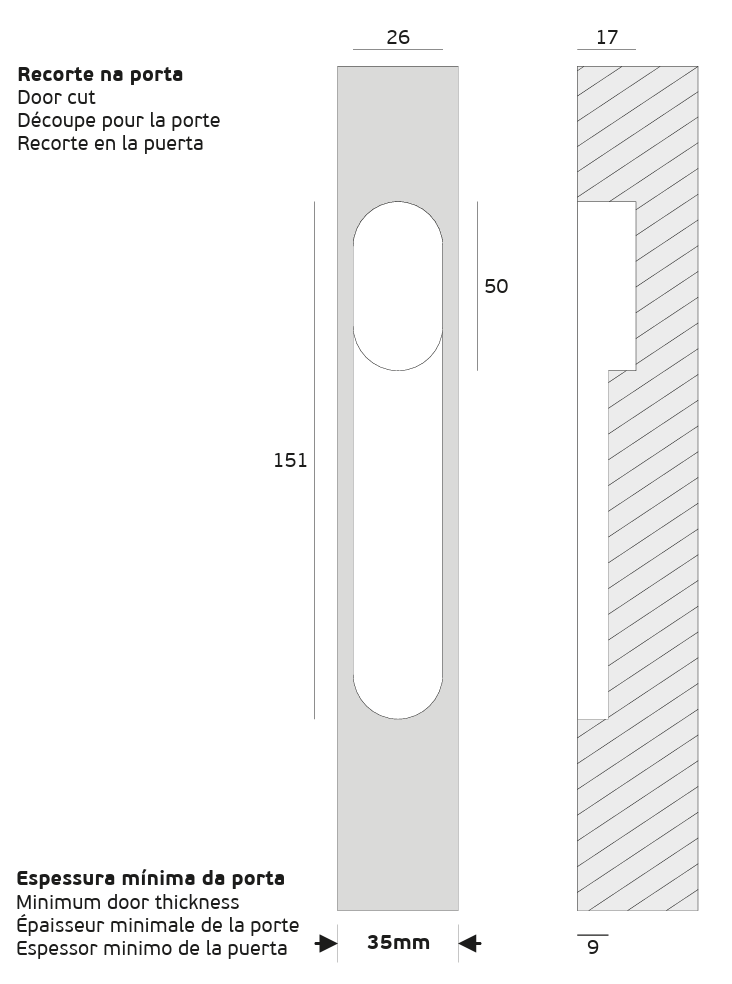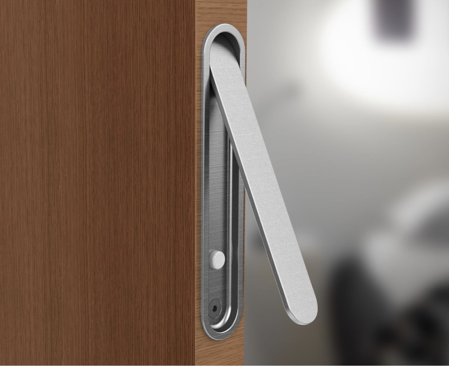 The oval-shaped recessed handle with a hidden lever is designed for use on sliding or swing doors. It’s typically installed on the edge of the door and paired with a magnetic lock when a completely invisible handle is desired.