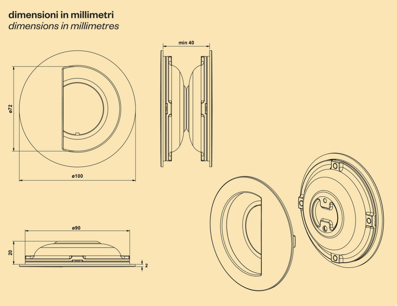 100х2х20 mm round pull handle for a 40 mm thick door;